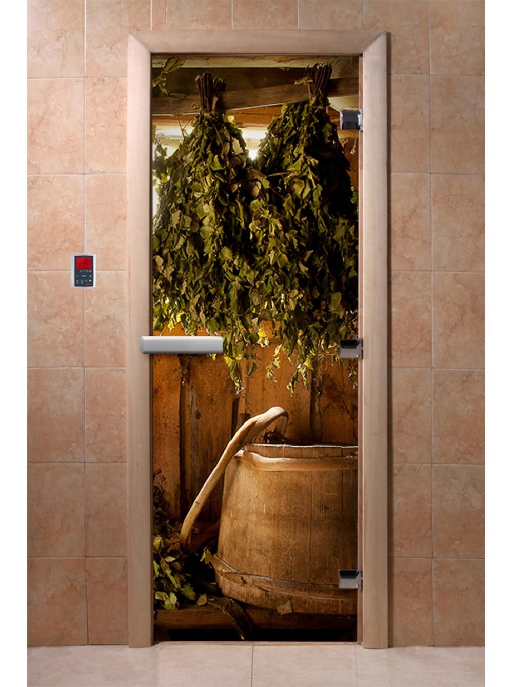 Дверь (липа) "Банные штучки" глухая "Банька" 1,9х0,7 м. с ручками и петлями