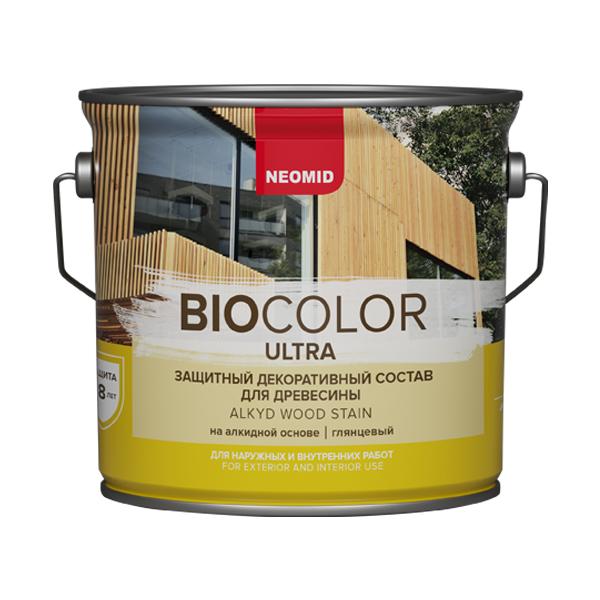 NEOMID Bio Color Ultra – высокоэффективный деревозащитный декоративный состав на алкидной основе для защиты и декоративной отделки деревянных поверхностей. Образует на поверхности глянцевую усиленную лаковую защитную пленку с высокими декоративными и защитными свойствами. Благодаря входящим в состав активным добавкам образующееся покрытие имеет пятиступенчатую систему защиты деревянной поверхности: