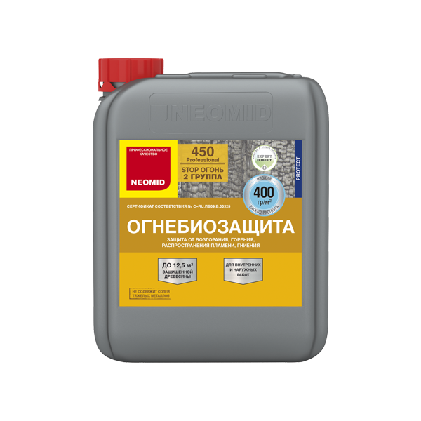 NEOMID 450 защищает древесину на срок до 7 лет от возгорания и распространения пламени, обеспечивая II группу огнезащитной эффективности согласно ГОСТ Р 53292 (переводя древесину в трудновоспламеняемый материал), и на срок 8-10 лет от гниения, возникновения плесени, при отсутствии контакта с влагой. Применяется как защитная пропитка для обработки деревянных стен, балок, стропильных систем, несущих брусьев, перекрытий, лаг, оконных и дверных блоков, а также других конструкций из древесины различного назначения.
