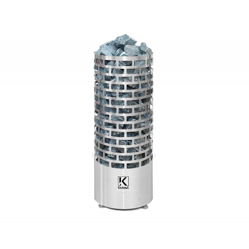Электрокаменка Karina Nova 15E предназначена для использования в парных объемом до 24м3. Печь выполнена в напольном варианте, цилиндрической формы. Напряжение питания – 380В. Данная модель укомплектована 6 ТЭНами, расположенными в виде треугольника. Внизу каменки находится бак для воды емкостью 4.2 л, который является парогенератором. Выше парогенератора расположена емкость под мелкие камни или нержавеющие шары объемом 5 л, вмещающая 10 кг мелкого камня, называемая закрытой каменкой с воронкой для подачи воды и получения мелкодисперсного пара. Электрокаменка Karina Nova 15E многофункциональна, и при правильной эксплуатации она подойдет для любителей как финской сауны, так и русской бани.
