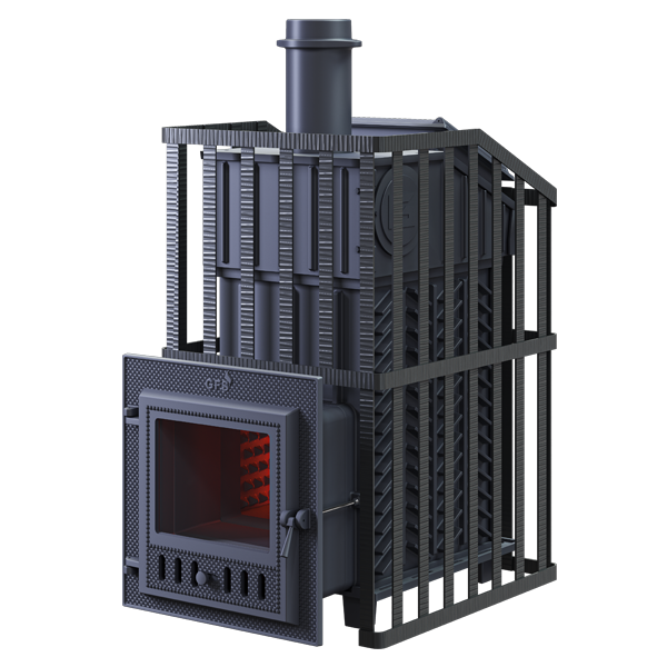 GFS-ЗК в сетке 18(М) Ураган - расширенный комплект печи GFS-ЗК в сетке. Максимально приближенный вариант печи для режимов русской парной, имеющий непосредственно закрытую чугунным коробом каменку, дверцу для пара с ручкой из бука, увеличенную до 50см чугунную стартовую трубу. Печь легко модернизируется до полноценной печи предназначенной для Русской бани путем замены стальной сетки на каменную облицовку без демонтажа дымохода.